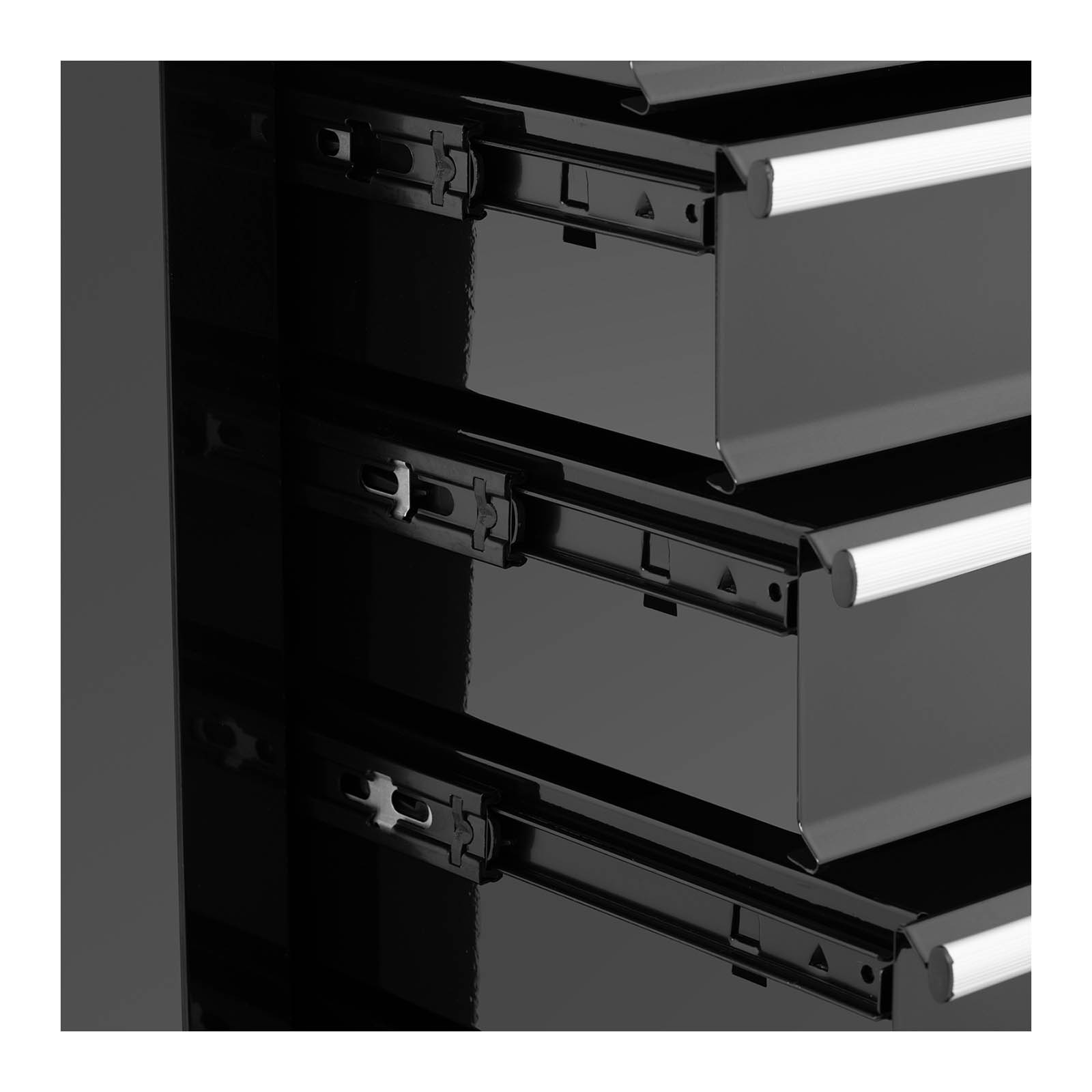 The five 51 x 28 x 10 cm large compartments each carry a weight of up to 5 kg. Since the upper shelf and work surface can be loaded with additional 25 kg , the total load of the workshop trolley adds up to an impressive 50 kg. The precisely fitting silicone mats inside the compartments and on the 61 x 32.5 cm large shelf reduce the noise level enormously, prevent scratches in the surface and protect the tool. Nothing can slip here! Even with maximum load, the professional tool trolley is always agile and easy to manoeuvre thanks to four smooth-running wheels and the wide handle. Two parking brakes block the two swivel castors and prevent them from rolling away. The stable lock of the tool trolley, which can be locked, not only protects the drawers against unintentional opening during transport, but also protects valuable tools from unauthorized access. Two keys are included in the scope of delivery. The robust tool trolley empty is made of powder-coated steel, which makes the entire construction particularly durable, even in the harsh environment of a car workshop or factory hall. In addition, all materials used are very easy to care for. This workshop trolley will therefore provide you with loyal service for many years!